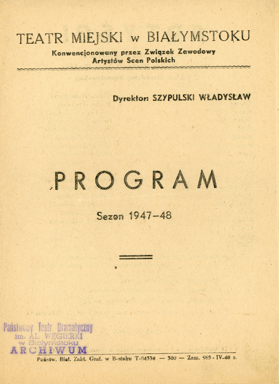Opis: Pierwsza strona programu do spektaklu „Artyści” – 03.04.1948 r.