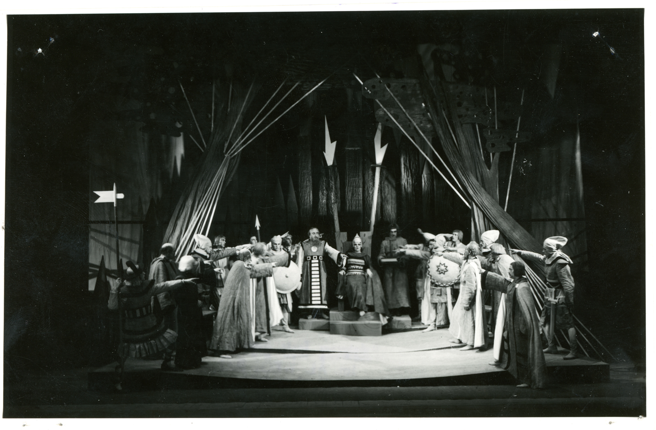 Opis: Spektakl „Balladyna” Juliusza Słowackiego, premiera 05.10.1948 r., reżyseria: Maria Jabłonkówna, scenografia:. A. Jędrzejewski i W. Lange, Z. Węgierkowicz, na zdjęciu: Zbigniew Michałowski (Kostryn), Karolina Borchard (Balladyna)
