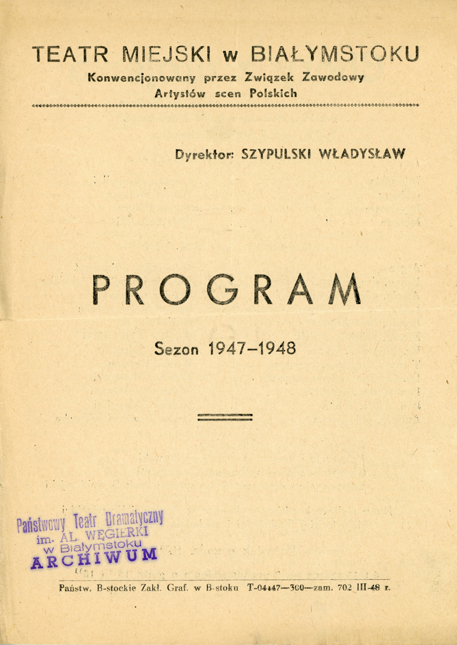Opis: Pierwsza strona programu do spektaklu „Chory z urojenia” – 04.03.1948 r.