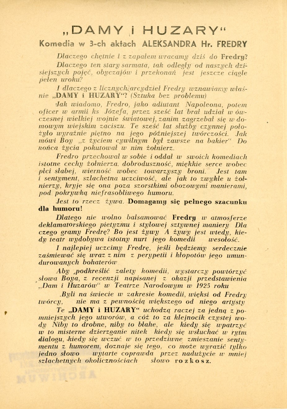 Opis: Trzecia strona programu do spektaklu "Damy i huzary" - 30.10.1946 r.