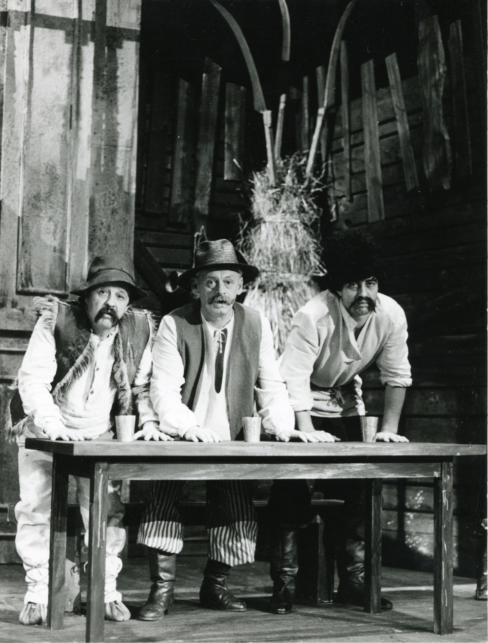Opis: Spektakl „Indyk” Sławomir Mrożek, premiera 05.11.1983 Białystok, reż. Tadeusz Kozłowski, scen. Ryszard Kuzyszyn, na zdjęciu: Tadeusz Kozłowski (Chłop I), Sławomir Olszewski (Chłop II), Józef Sajdak (Chłop III)