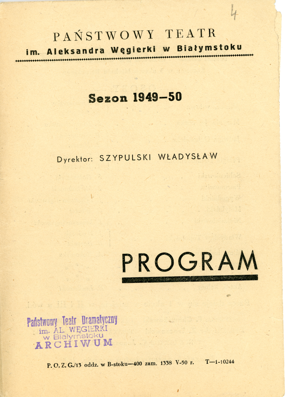 Opis: Pierwsza strona programu na sezon 1949 / 1950 ze spektaklem „Klub Kawalerów”