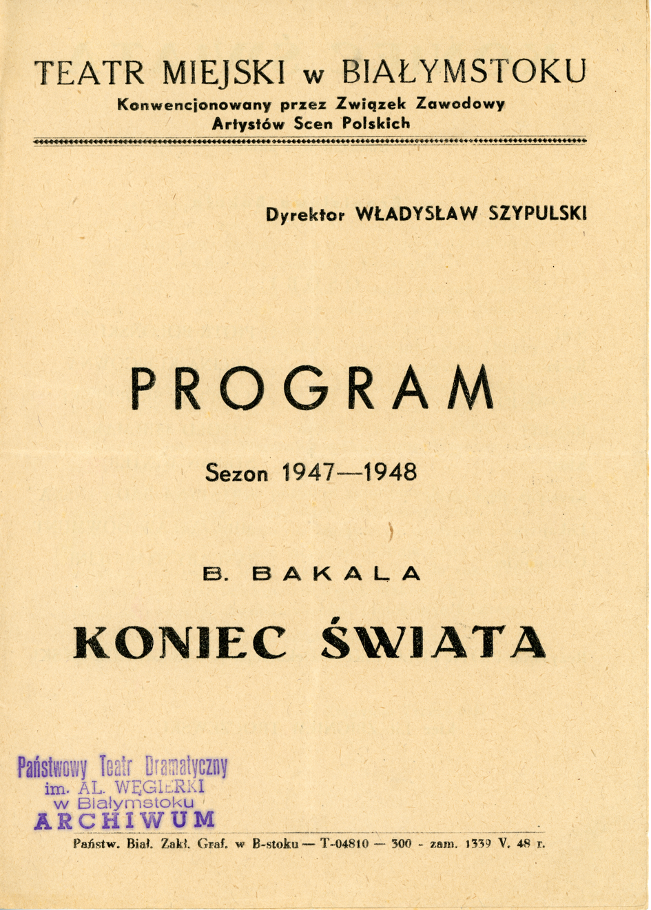 Opis: Pierwsza strona programu spektaklu „Koniec świata” – 21.05.1948