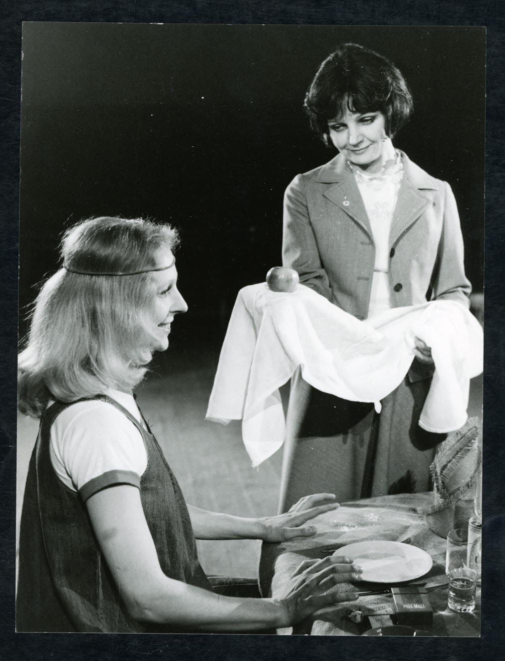 Opis: Spektakl „Motyle są wolne” Leonard Gershe, przekład Anna Frąckiewicz, premiera 14.05.1983 Giżycko, 1983-11-06 - Białystok, reż. Bogdan Michalik, scen. Bronisław Modrzejewski na zdjęciu: Helena Wizłło (Pani Baker), Krystyna Rayska (Jill)