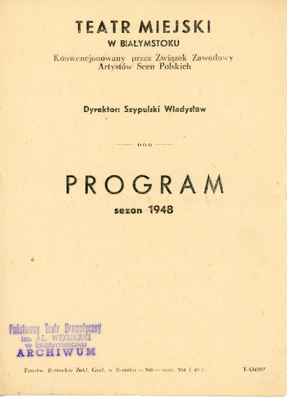 Opis: Pierwsza strona programu do spektaklu „Oberżysta” – 07.02.1948