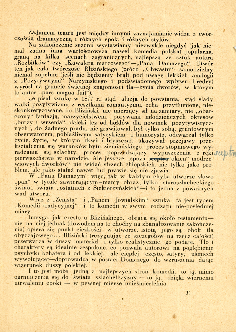 Opis: Trzecia strona programu z roku 1949 ze spektaklu „Pan Damazy”
