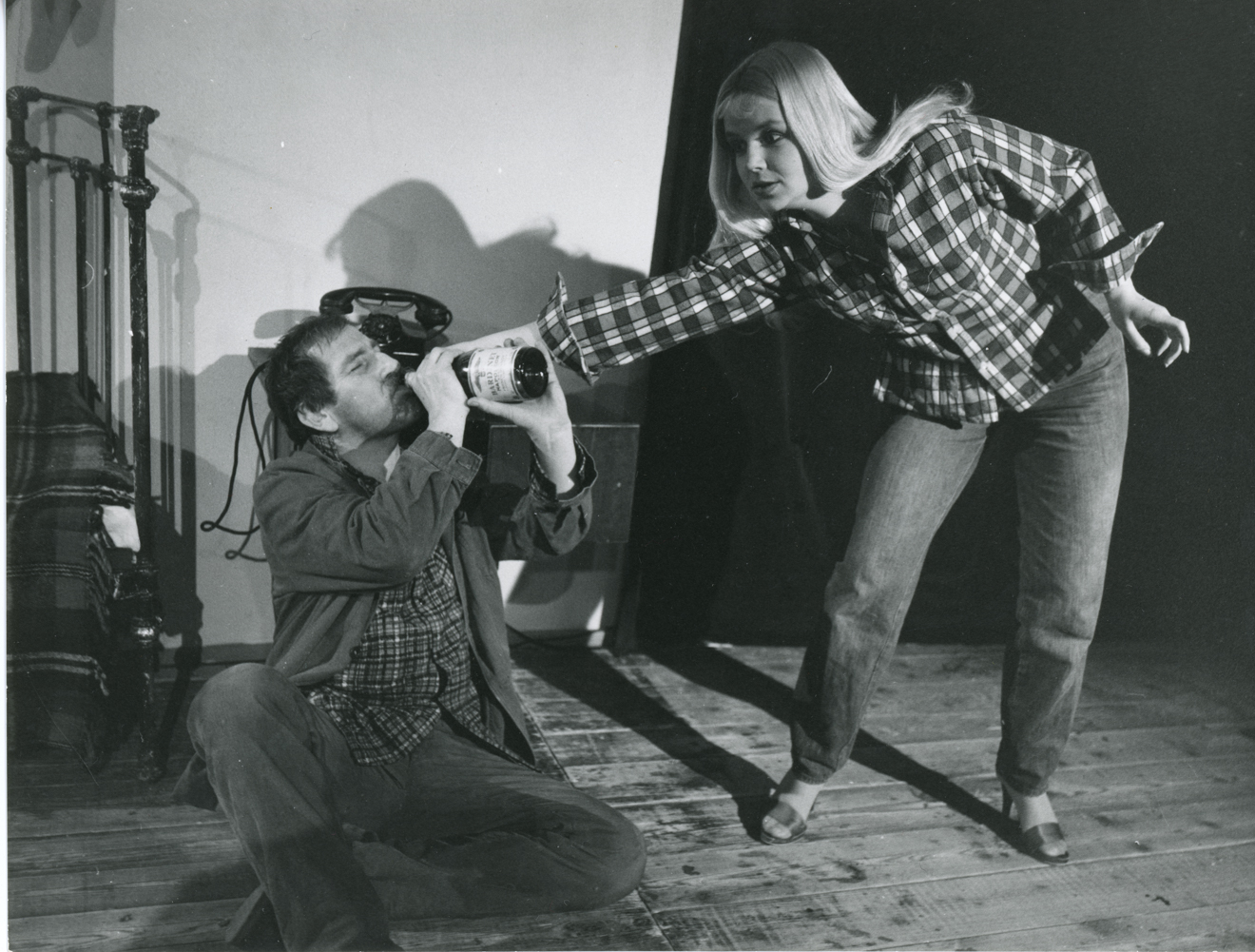 Opis: Spektakl „Próg” Aleksej Dudarau, premiera 14.01.1984 Białystok, reż. Maria Aleksandrowicz-Kraśko, scen. Jakub Konarzewski, na zdjęciu: Andrzej Karolak (Andrzej Busałaj), Katarzyna Terlecka (Alina)