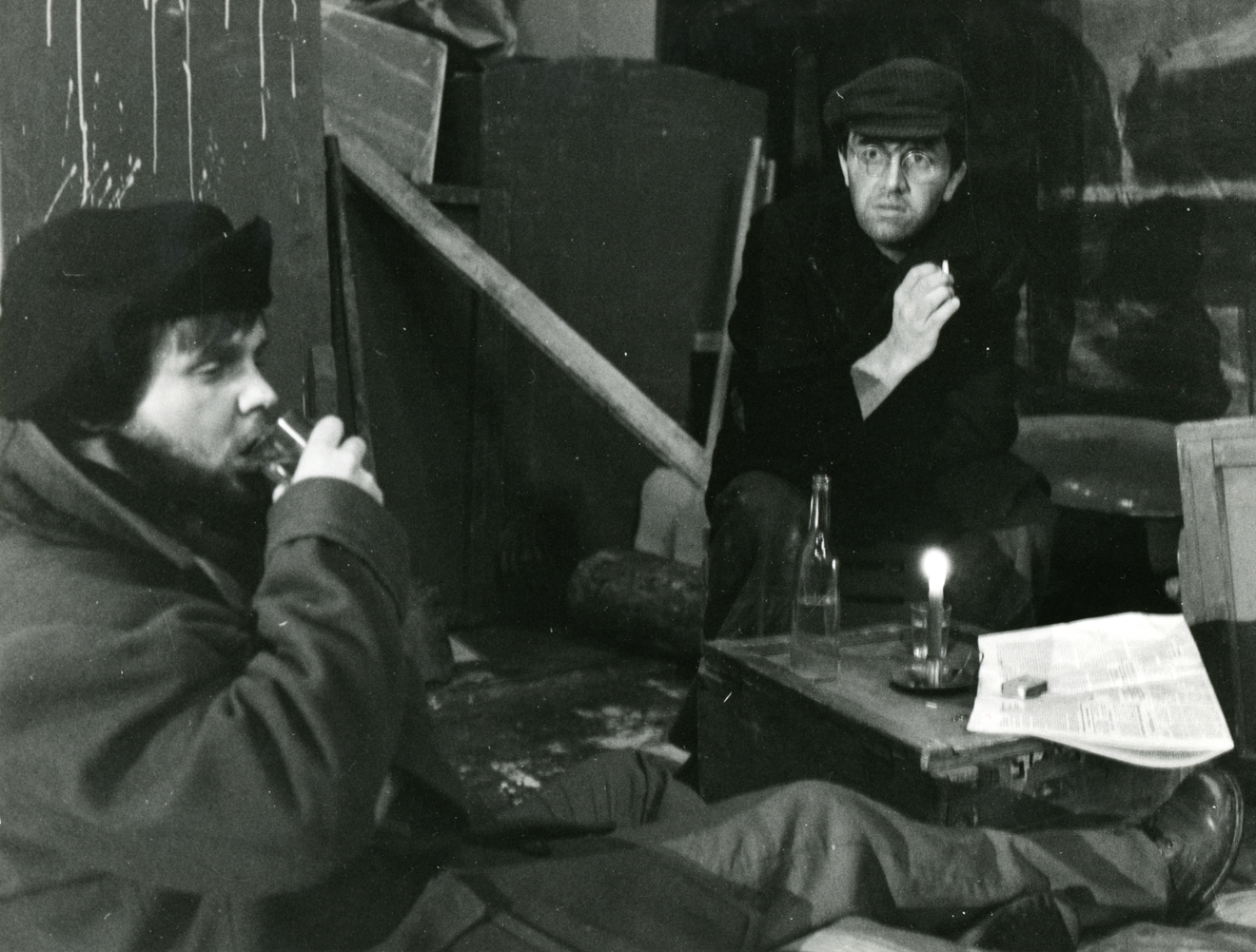 Opis: Spektakl „Próg” Aleksej Dudarau, premiera 14.01.1984 Białystok, reż. Maria Aleksandrowicz-Kraśko, scen. Jakub Konarzewski, na zdjęciu: Krzysztof Nowik (Pijak I), xxx (Pijak II)