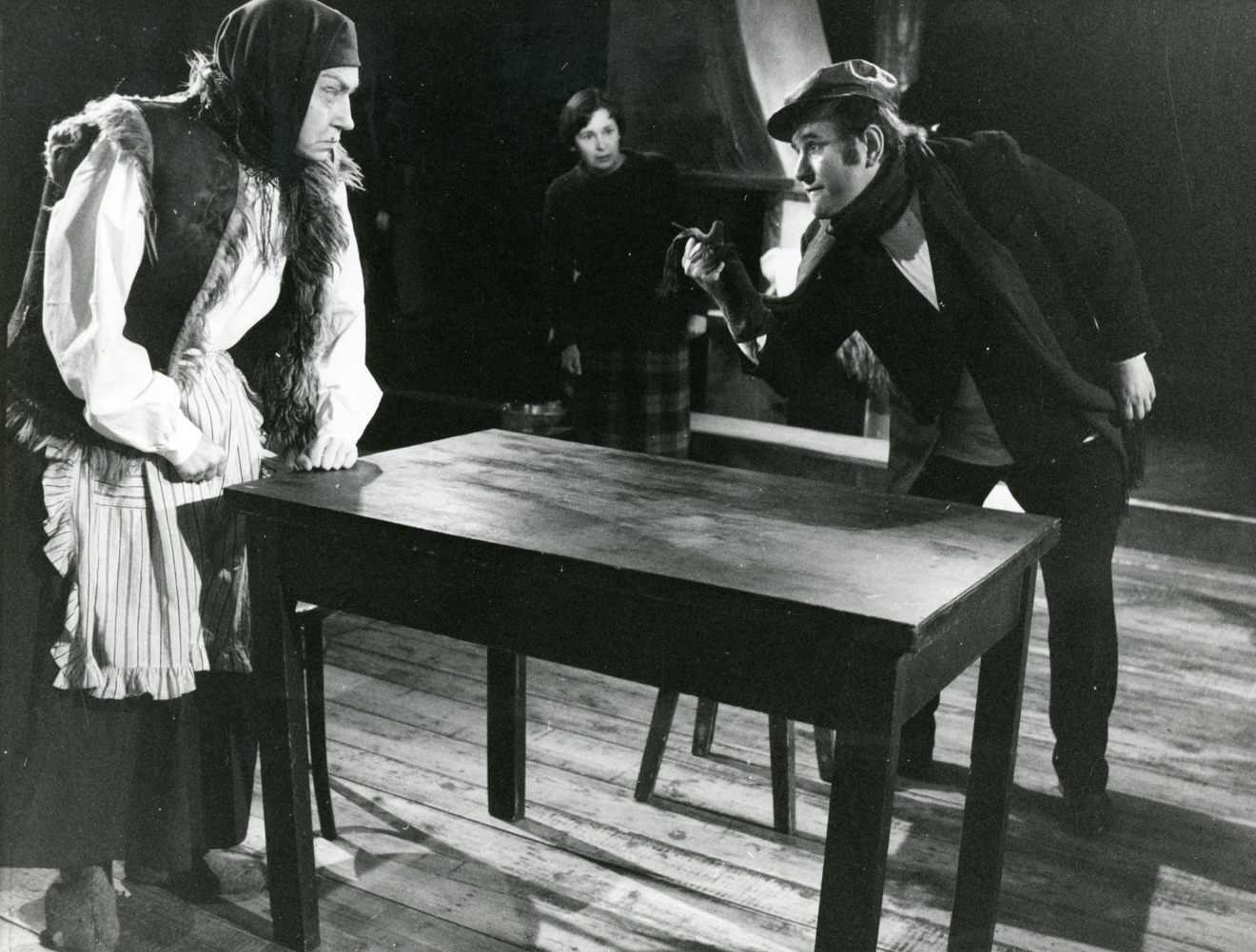 Opis: Spektakl „Próg” Aleksej Dudarau, premiera 14.01.1984 Białystok, reż. Maria Aleksandrowicz-Kraśko, scen. Jakub Konarzewski, na zdjęciu: Katarzyna Terlecka (Alina), Danuta Kierklo (Nina), Jerzy Siech (Szarhajou)