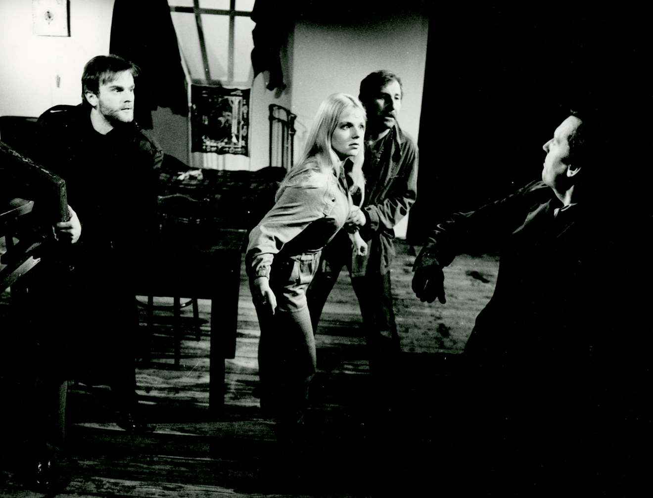 Opis: Spektakl „Próg” Aleksej Dudarau, premiera 14.01.1984 Białystok, reż. Maria Aleksandrowicz-Kraśko, scen. Jakub Konarzewski, na zdjęciu: Paweł Binkowski (Drahun), Wiesław Krupa (Krasouski), Andrzej Karolak (Andrzej Busałaj), Katarzyna Terlecka (Alina)