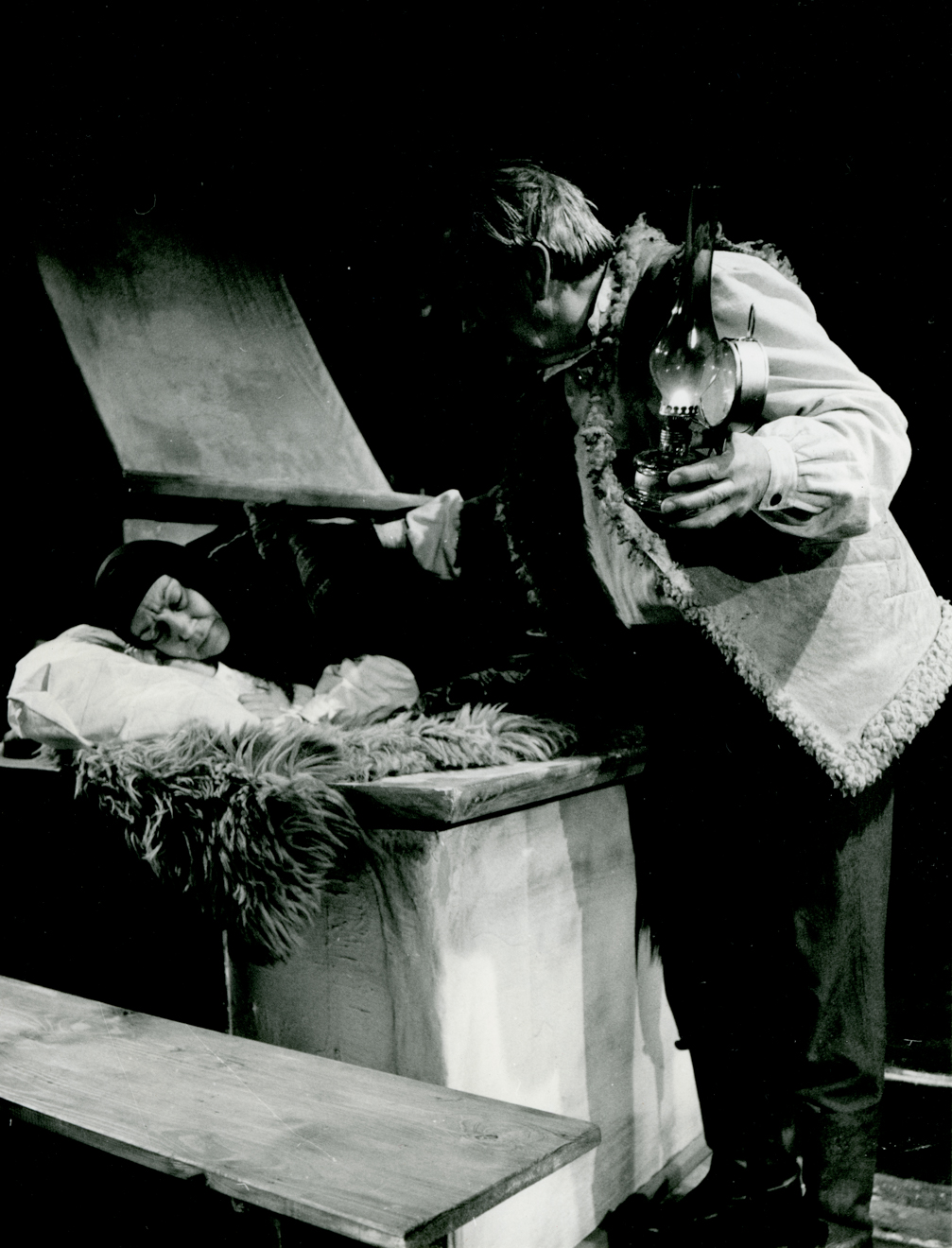 Opis: Spektakl „Próg” Aleksej Dudarau, premiera 14.01.1984 Białystok, reż. Maria Aleksandrowicz-Kraśko, scen. Jakub Konarzewski, na zdjęciu: Katarzyna Terlecka (Alina), Wiesław Krupa (Krasouski)