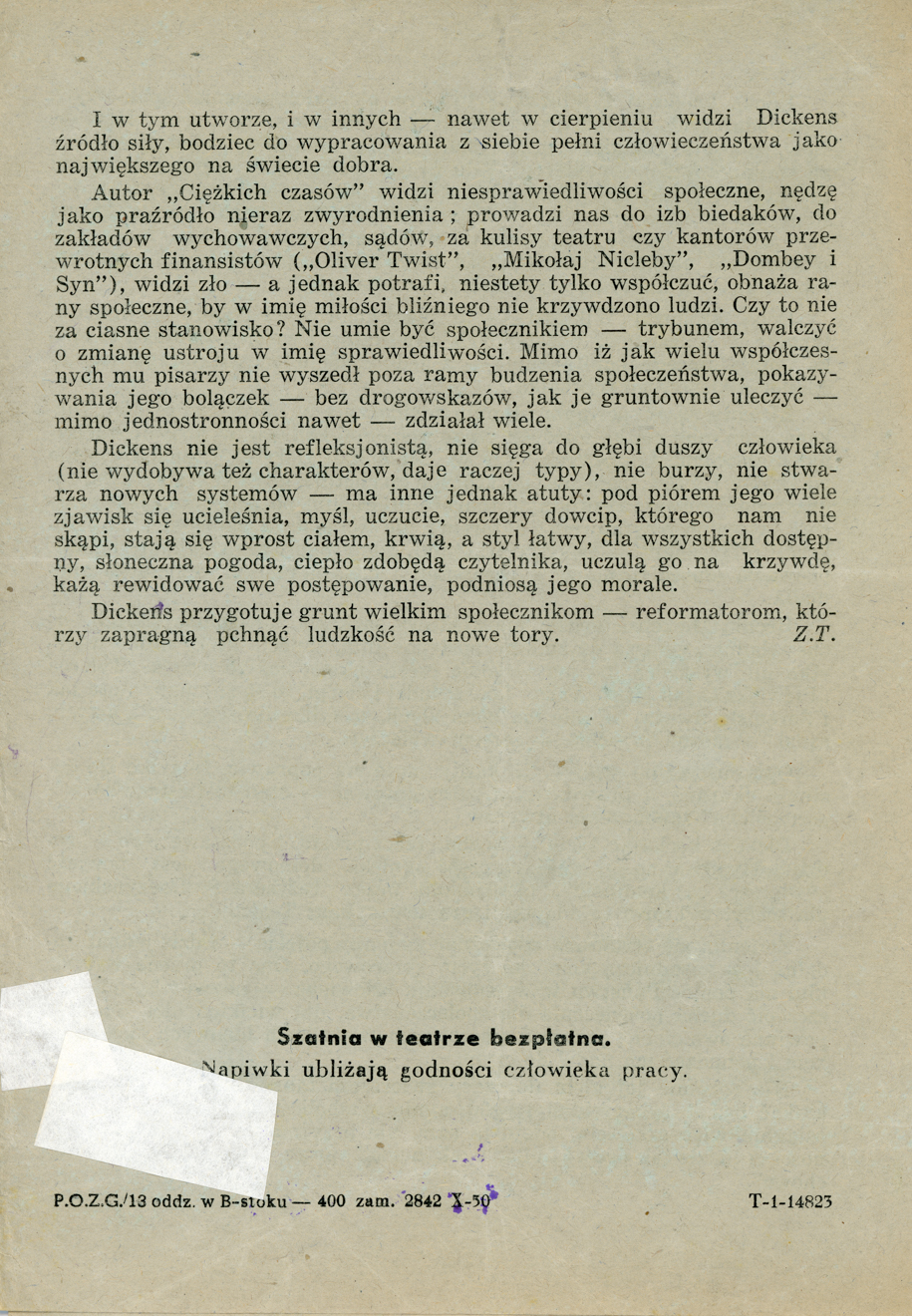 Opis: Czwarta strona programu na rok 1950 ze spektaklem „Świerszcz za Kominem”
