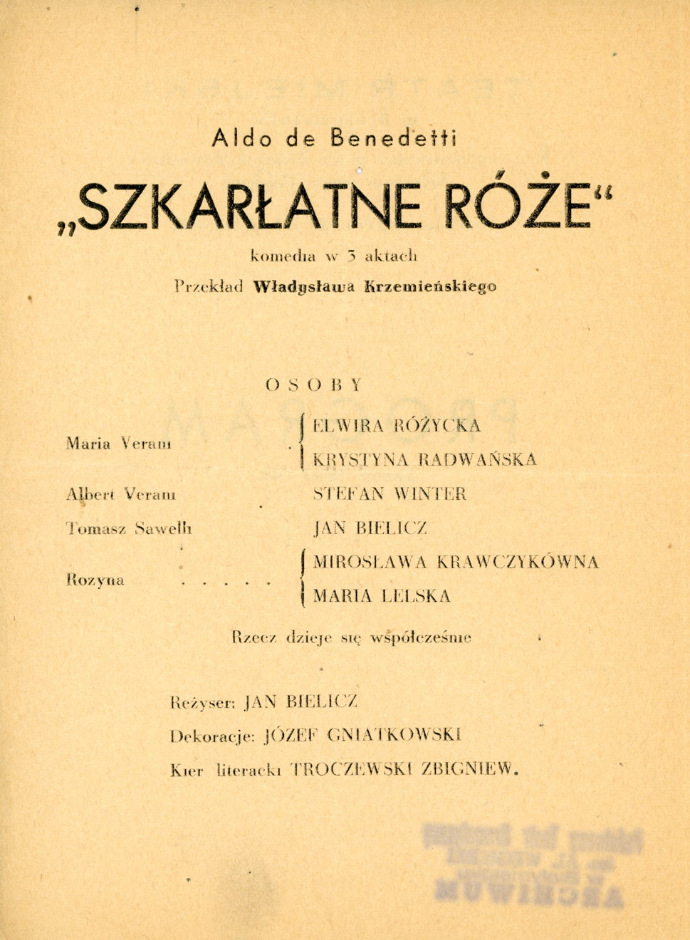 Opis: Druga strona programu do spektaklu "Szarłatne róże" - 24.10.1947