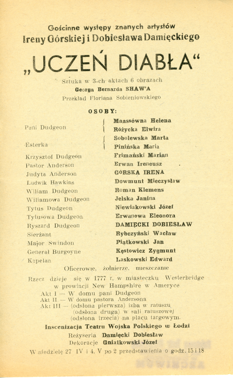 Opis: Trzecia strona programu do spektaklu "Uczeń diabła" - 26.04.1947