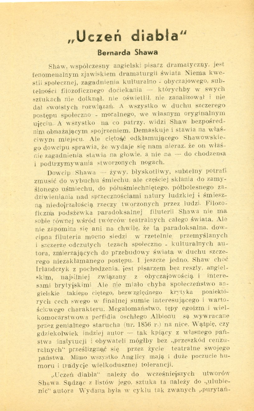 Opis: Czwarta strona programu do spektaklu "Uczeń diabła" - 26.04.1947