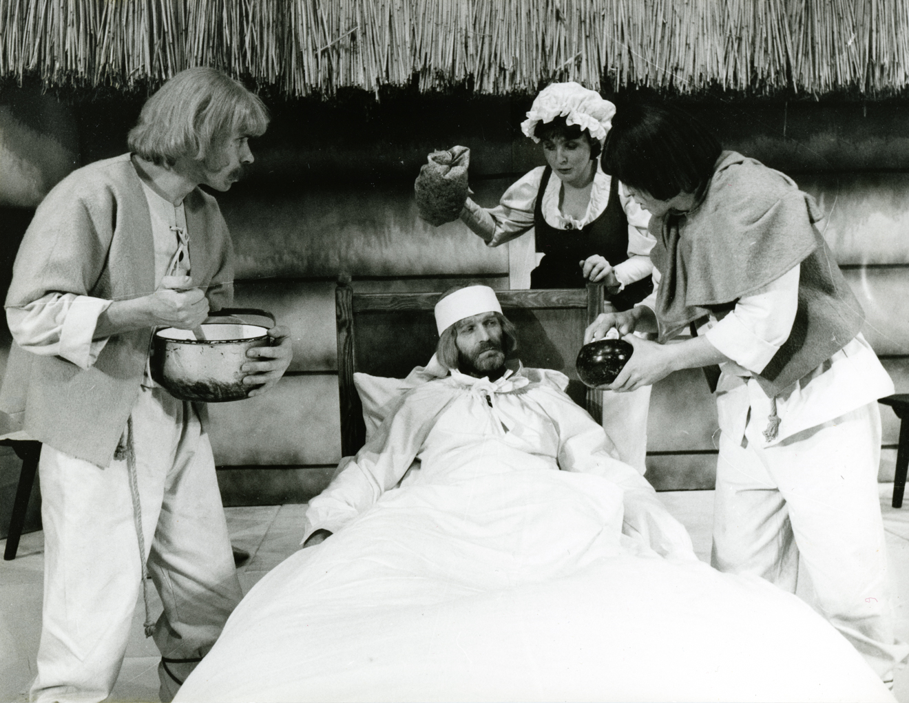 Opis: Spektakl „Żabie czary” Henryk Matus, premiera 07.01.1984 Białystok, reż. Tadeusz Kozłowski, scen. Adam Miriam, oprac. muz. Zbigniew Porzycki, na zdjęciu: Franciszek Utko (Rybak), Andrzej Redwans (Drwal Andrzej), Sławomir Olszewski (Rybak), Miriam Aleksandrowicz-Kraśko (Małgosia)