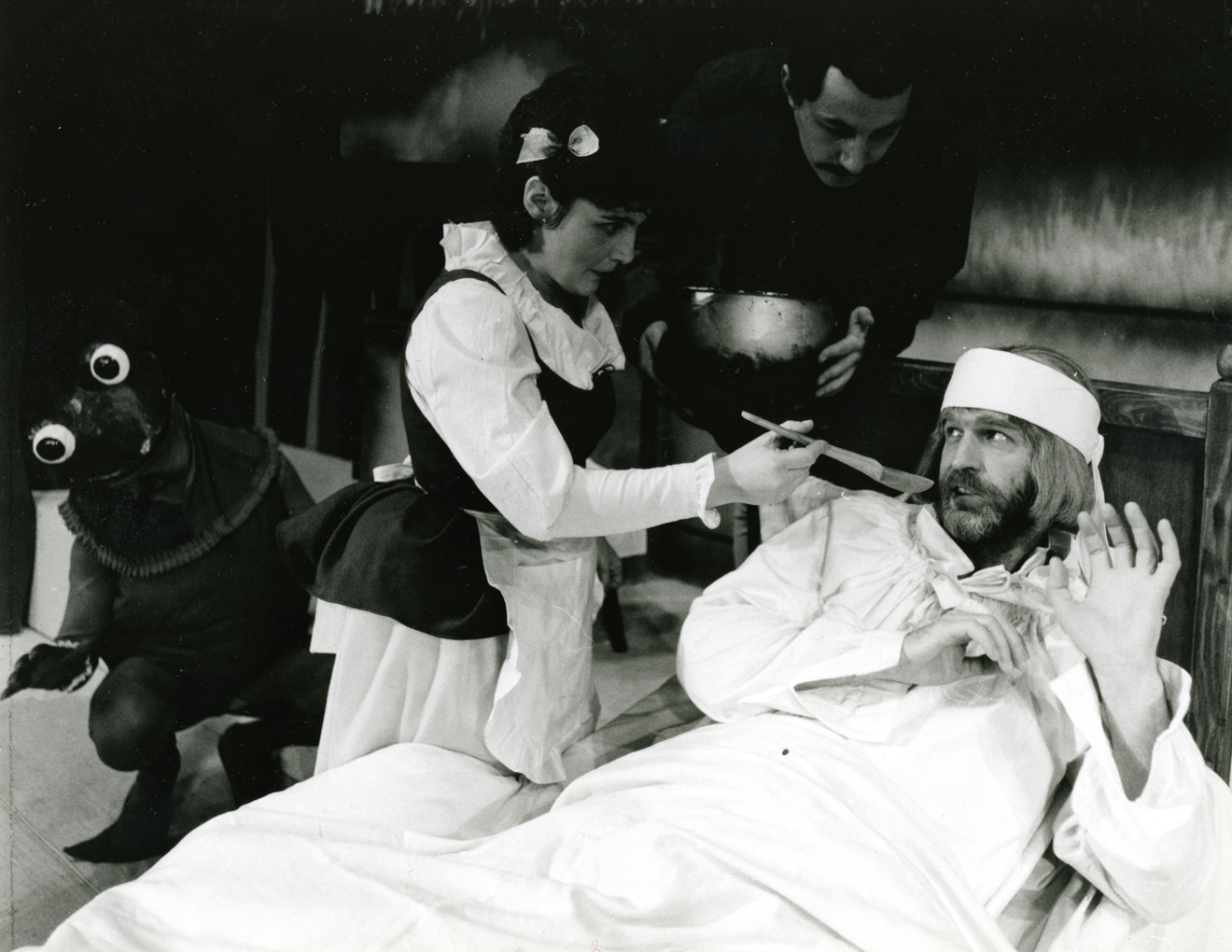 Opis: Spektakl „Żabie czary” Henryk Matus, premiera 07.01.1984 Białystok, reż. Tadeusz Kozłowski, scen. Adam Miriam, oprac. muz. Zbigniew Porzycki, na zdjęciu: Krzysztof Nowik (Królewicz Żaba), Miriam Aleksandrowicz-Kraśko (Małgosia), Andrzej Redwas (Drwal Andrzej), Zbigniew Borek (Filutek)