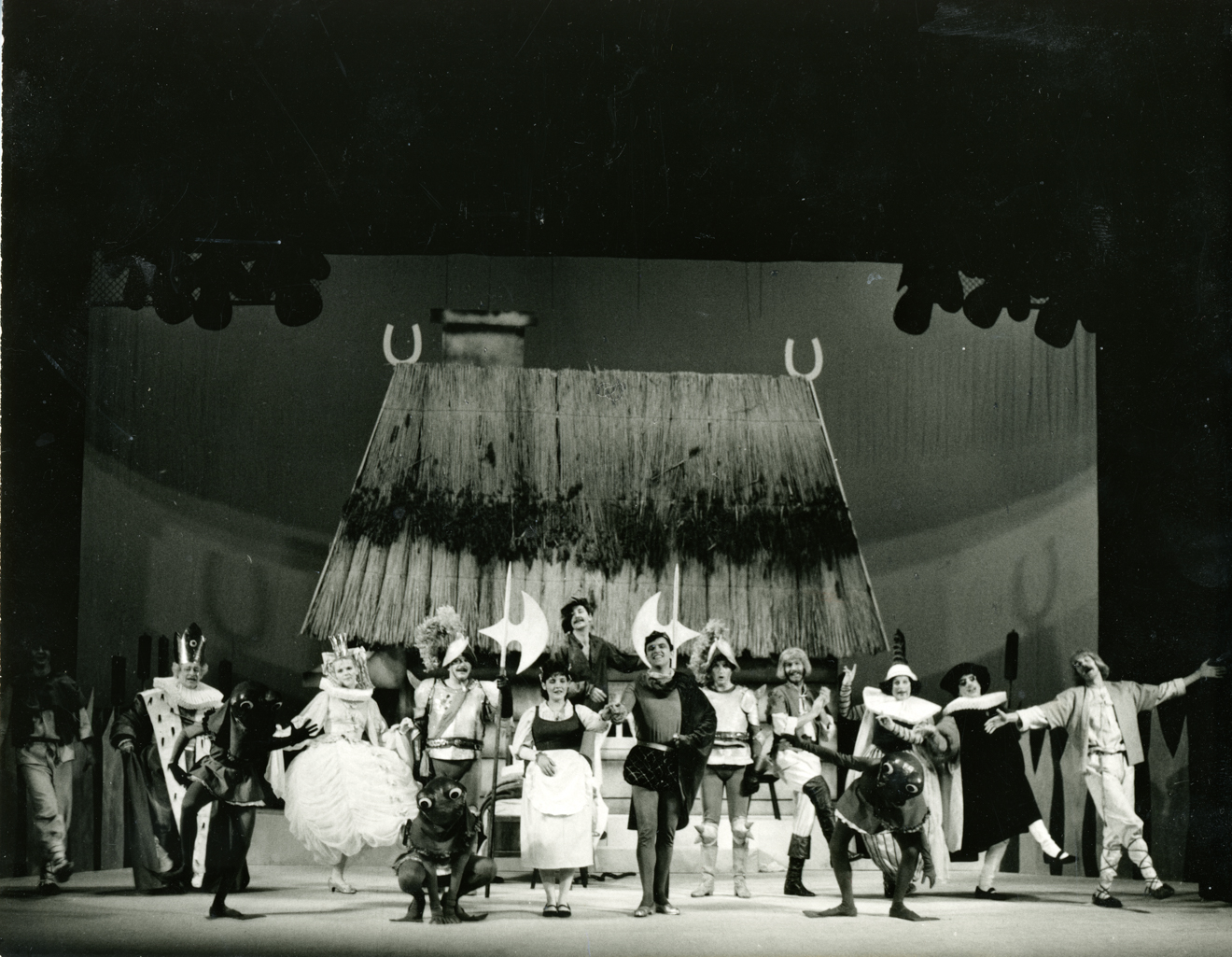 Opis: Spektakl „Żabie czary” Henryk Matus, premiera 07.01.1984 Białystok, reż. Tadeusz Kozłowski, scen. Adam Miriam, oprac. muz. Zbigniew Porzycki, na zdjęciu: scena zbiorowa
