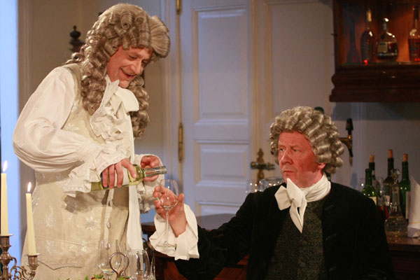W saloniku Hotelu Turyńskiego w Lipsku przybyły z Londynu Georg Fryderyk Händel (1685 – 1759) czeka z proszoną kolacją na swego gościa, Jana Sebastiana Bacha (1685-1750). Niebawem do wykwintnie zastawionego stołu oraz do … klawesynu zasiądą dwaj giganci muzyczni Baroku. Na stole stoją szparagi, pasztet, pieczony kapłon, homary, karczochy, baranie kotlety, marynowane borowiki, świeże smardze, opodal przednie wina, likiery, szampan. Dla Händla to codzienność, dla Bacha – niemal abstrakcja. Händel opowiada o światowych trendach, salonach, spotkaniach z koronowanymi głowami. Bach może zaoferować historię udręk i biedy źle opłacanego kantora, który musi wykarmić liczną rodzinę. O dziwo obaj są o siebie zazdrośni, obaj mają poczucie zmarnowanego życia. Jeden pożąda chwały i bogactwa, drugi oddałby wszystko za geniusz muzyczny swego rozmówcy.